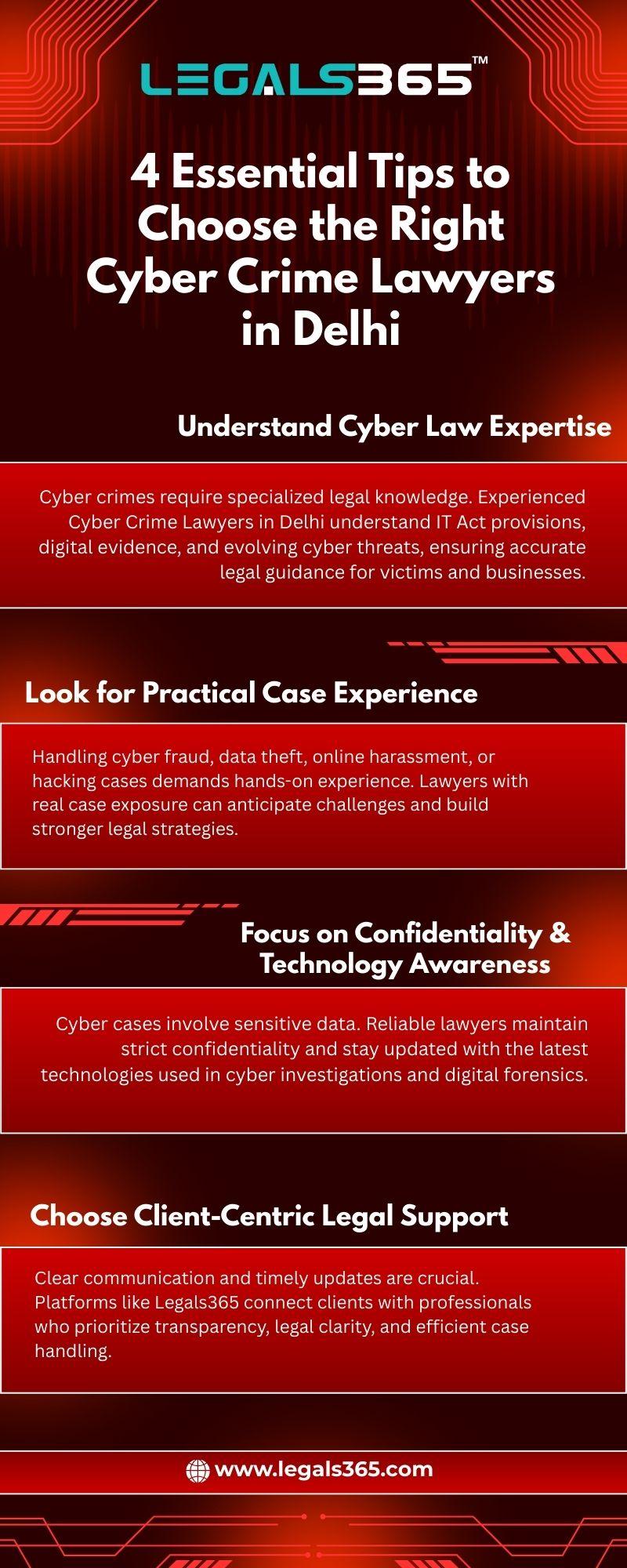 Visit Us - https://www.legals365.com/cyber-crime-lawyers-in-delhi/4 Essential Tips to Choose the Right Cyber Crime Lawyers in Delhi 1. Understand Cyber Law Expertise Cyber crimes require specialized legal knowledge. Experienced Cyber Crime Lawyers in Delhi understand IT Act provisions, digital evidence, and evolving cyber threats, ensuring accurate legal guidance for victims and businesses. 2. Look for Practical Case Experience Handling cyber fraud, data theft, online harassment, or hacking cases demands hands-on experience. Lawyers with real case exposure can anticipate challenges and build stronger legal strategies. 3. Focus on Confidentiality & Technology Awareness Cyber cases involve sensitive data. Reliable lawyers maintain strict confidentiality and stay updated with the latest technologies used in cyber investigations and digital forensics. 4. Choose Client-Centric Legal Support Clear communication and timely updates are crucial. Platforms like Legals365 connect clients with professionals who prioritize transparency, legal clarity, and efficient case handling. Visit Us - https://www.legals365.com/cyber-crime-lawyers-in-delhi/0 Kommentare 0 Anteile 114 Ansichten 0 Vorschau -