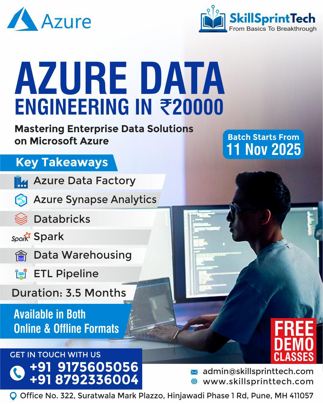 Boost your data career with an Azure Data Engineer online training course designed to build real-world cloud skills. SkillSprint Tech provides the best azure data engineer online training course. This course helps you master Azure data services, data storage, transformation, and pipeline building using tools like Azure Synapse, Data Factory, and Databricks. Whether you're just starting out or you're already in the IT field, this program will empower you to tackle end-to-end data solutions with confidence.