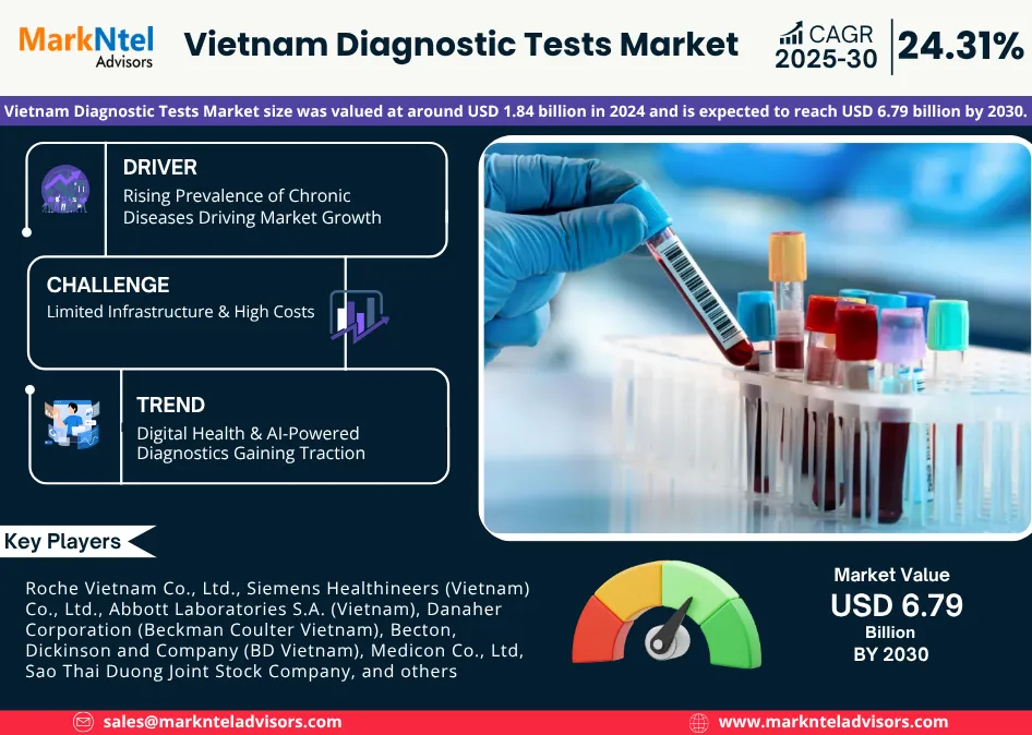 As per MarkNtel Advisors the Vietnam Diagnostic Tests Market size was valued at around USD 1.84 billion in 2024 and is expected to reach USD 6.79 billion by 2030. Along with this, the market is estimated to grow at a CAGR of around 24.31% during the forecast period, i.e., 2025-30.