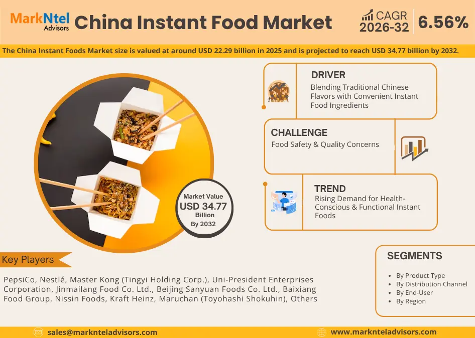According to MarkNtel Advisors study The future of China Instant Food Market size is valued at around USD 22.29 billion in 2025 and is projected to reach USD 34.77 billion by 2032. Along with this, the market is estimated to grow at a CAGR of around 6.56% during the forecast period, i.e., 2026-32.