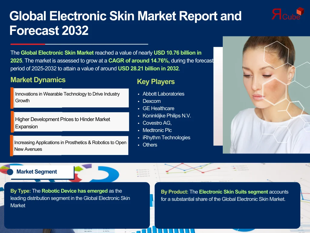 The Global Electronic Skin Market reached a value of nearly USD 10.76 billion in 2025. The market is assessed to grow at a CAGR of around 14.76%, during the forecast period of 2025-2032 to attain a value of around USD 28.21 billion in 2032. The industry is observing rapid expansion, compelled by developments in wearable technology & the mounting adoption of smart healthcare solutions. E-skin technology, which mimics human skin's sensory capabilities, is gaining traction in healthcare, robotics, and prosthetics.