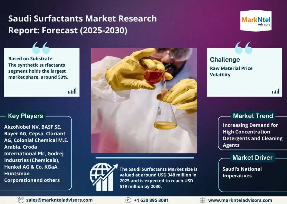 According to MarkNtel Advisors study The future of Saudi Surfactants Market size is valued at around USD 348 million in 2025 and is expected to reach USD 519 million by 2030. Along with this, the market is estimated to grow at a CAGR of around 8.32% during the forecast period, i.e., 2025-30.