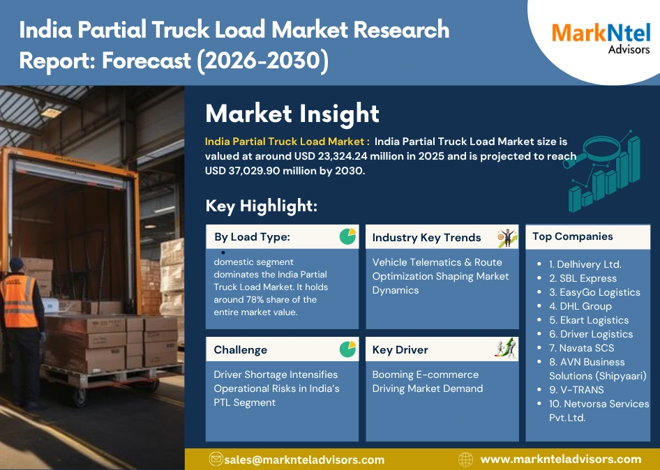 According to MarkNtel Advisors study The future of India Partial Truck Load Market size is valued at around USD 23,324.24 million in 2025 and is projected to reach USD 37,029.90 million by 2030. Along with this, the market is estimated to grow at a CAGR of around 9.7% during the forecast period, i.e., 2026-30.
