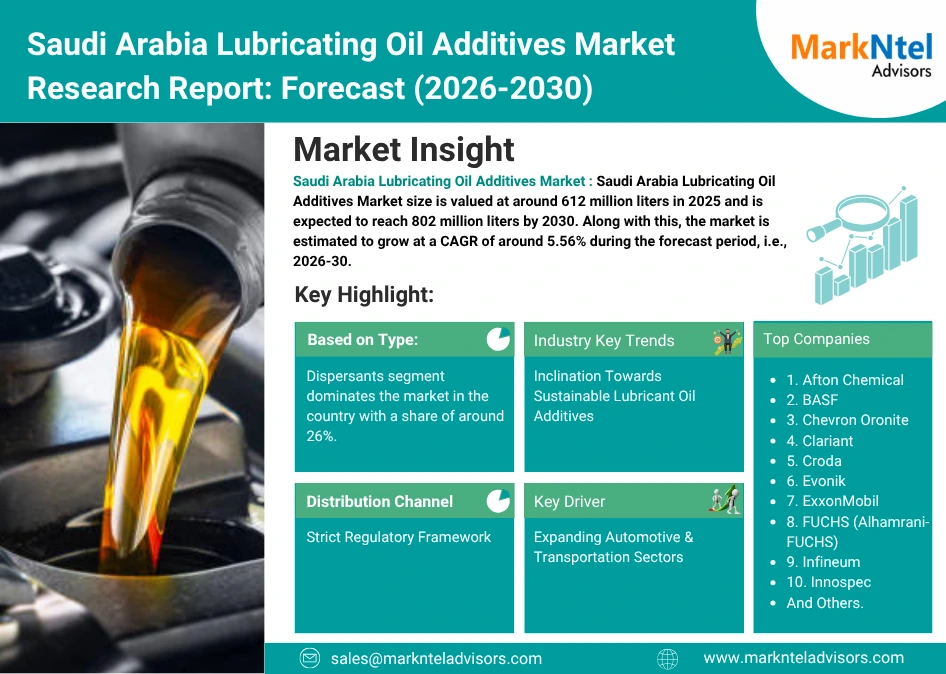 According to MarkNtel Advisors study The future of Saudi Arabia Lubricating Oil Additives Market size is valued at around 612 million liters in 2025 and is expected to reach 802 million liters by 2030. Along with this, the market is estimated to grow at a CAGR of around 5.56% during the forecast period, i.e., 2026-30.