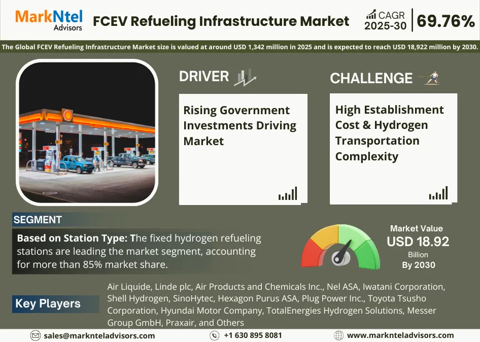 According to MarkNtel Advisors study The future of FCEV Refueling Infrastructure Market size is valued at around USD 1,342 million in 2025 and is expected to reach USD 18,922 million by 2030. Along with this, the market is estimated to grow at a CAGR of around 69.76% during the forecast period, i.e., 2026-30.