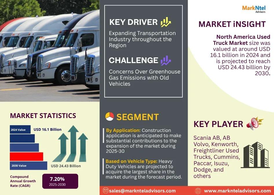 MarkNtel Advisors, a leading market research and consulting firm, has announced the release of its latest study titled North America Used Truck Market Research Report: Forecast (2025–2030). This report provides a detailed assessment of the North America Used Truck, covering its evolving dynamics, emerging trends, key growth drivers, major challenges, and competitive landscape.
