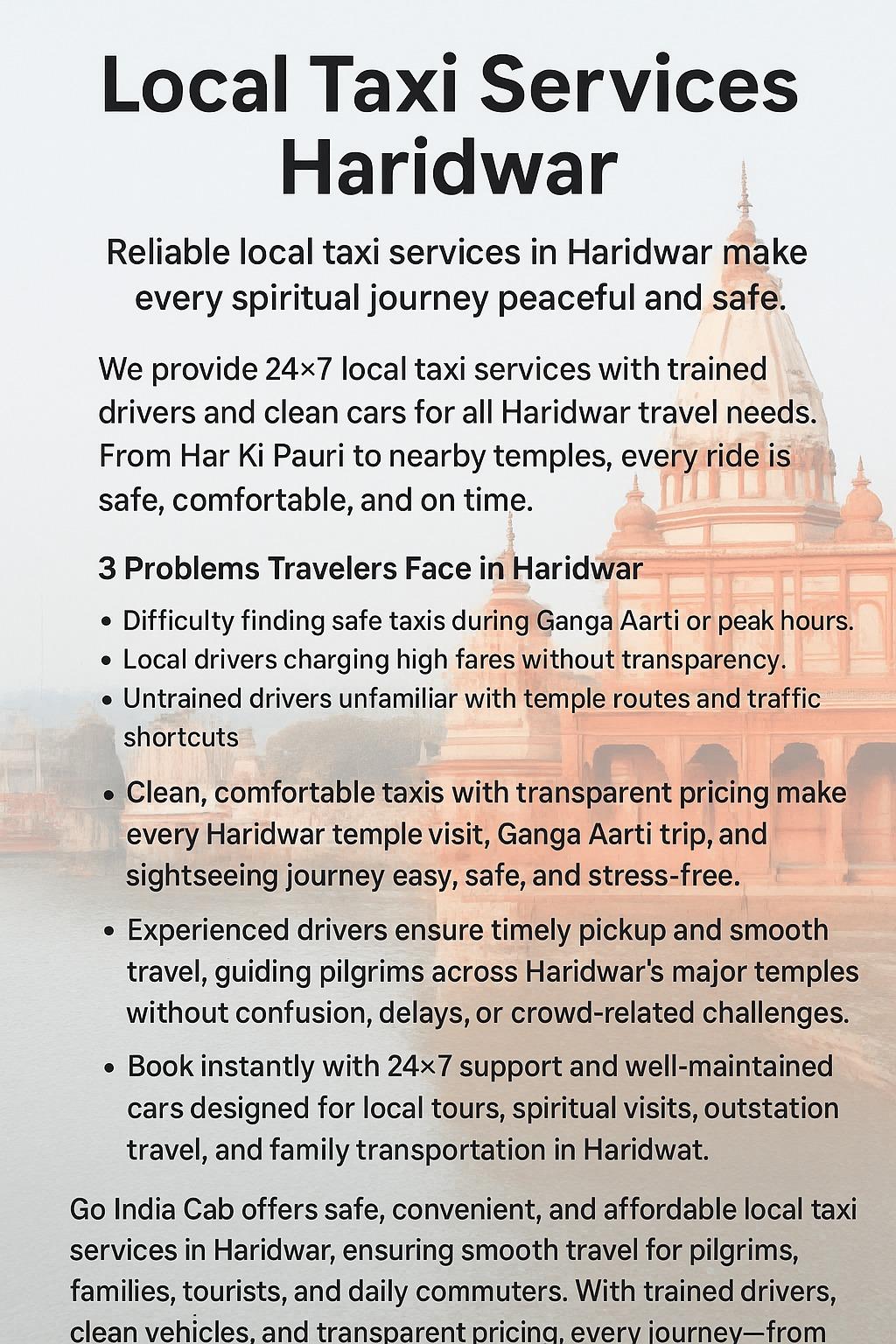 Haridwar is a divine city where every journey should feel peaceful, safe, and comfortable. Go India Cab provides the most trusted local taxi services in Haridwar with trained drivers, clean cars, transparent fares, and 24×7 support. Whether you're visiting Har Ki Pauri, exploring temples, or planning an outstation trip, we ensure a smooth, reliable, and worry-free travel experience.
