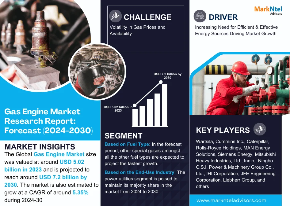According to MarkNtel Advisors study The future of Global Gas Engine Market size was valued at around USD 5.02 billion in 2023 and is projected to reach around USD 7.2 billion by 2030. The market is also estimated to grow at a CAGR of around 5.35% during the forecast period, i.e., 2024-30.