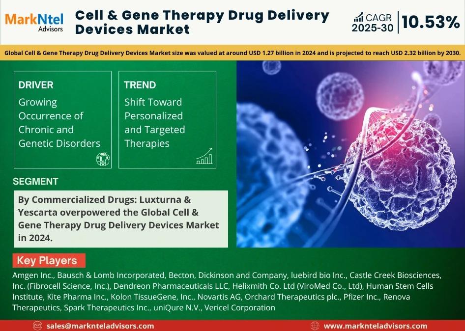 MarkNtel Advisors, a leading market research and consulting firm, has announced the release of its latest study titled Cell & Gene Therapy Drug Delivery Devices Market Research Report: Forecast (2025–2030). This report provides a detailed assessment of the Cell & Gene Therapy Drug Delivery Devices, covering its evolving dynamics, emerging trends, key growth drivers, major challenges, and competitive landscape.