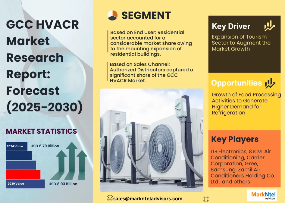 As per recent study by MarkNtel Advisors The GCC HVACR Market size was valued at around USD 6.79 billion in 2024 and is projected to reach USD 8.93 billion by 2030. Along with this, the market is estimated to grow at a CAGR of around 4.67% during the forecast period, i.e., 2025-30.