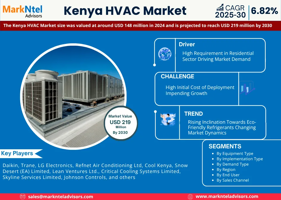 As per recent study by MarkNtel Advisors The Kenya HVAC Market size was valued at around USD 148 million in 2024 and is projected to reach USD 219 million by 2030. The market is also estimated to grow at a CAGR of around 6.82% during the forecast period, i.e., 2025-30.