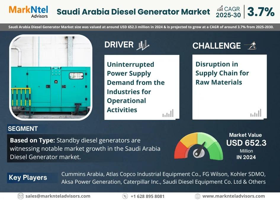 MarkNtel Advisors, a leading market research and consulting firm, has announced the release of its latest study titled Saudi Arabia Diesel Generator Market Research Report: Forecast (2025–2030). This report provides a detailed assessment of the Saudi Arabia Diesel Generator, covering its evolving dynamics, emerging trends, key growth drivers, major challenges, and competitive landscape.