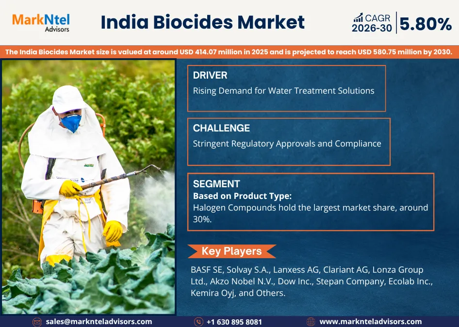 According to MarkNtel Advisors study The future of India Biocides Market size is valued at around USD 414.07 million in 2025 and is projected to reach USD 580.75 million by 2030. Along with this, the market is estimated to grow at a CAGR of around 5.80% during the forecast period, i.e., 2026-30.