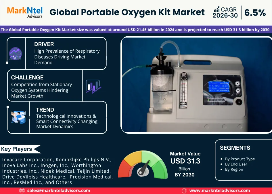 According to MarkNtel Advisors study The future of Portable Oxygen Kit Market size was valued at around USD 21.45 billion in 2024 and is projected to reach USD 31.3 billion by 2030. Along with this, the market is estimated to grow at a CAGR of around 6.5% during the forecast period, i.e., 2026-30.