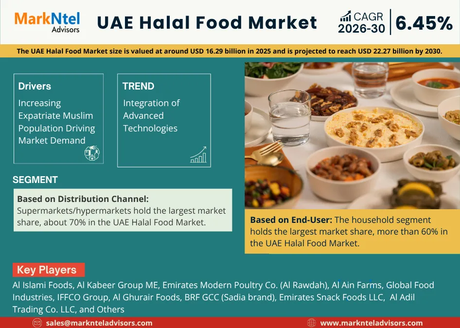 According to MarkNtel Advisors study The future of UAE Halal Food Market size is valued at around USD 16.29 billion in 2025 and is projected to reach USD 22.27 billion by 2030. Along with this, the market is estimated to grow at a CAGR of around 6.45% during the forecast period, i.e., 2026-30.