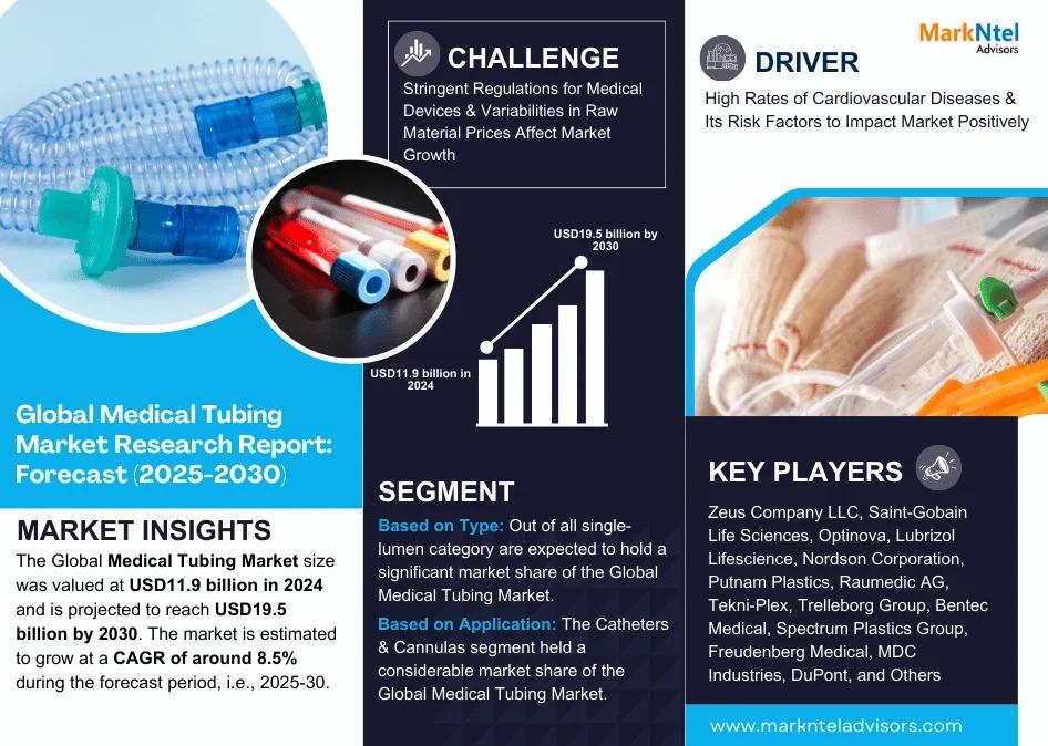 MarkNtel Advisors, a leading market research and consulting firm, has announced the release of its latest study titled Medical Tubing Market Research Report: Forecast (2025–2030). This report provides a detailed assessment of the Medical Tubing, covering its evolving dynamics, emerging trends, key growth drivers, major challenges, and competitive landscape.