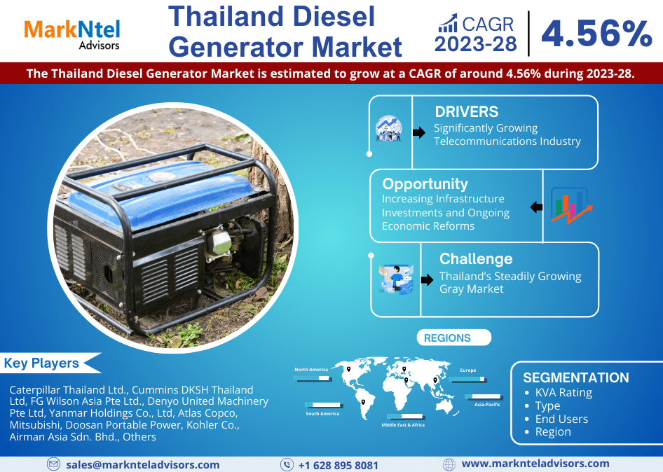 According to MarkNtel Advisors study The future of Thailand Diesel Generator Market is estimated to grow at a CAGR of around 4.56% during the forecast period, i.e., 2023-28.