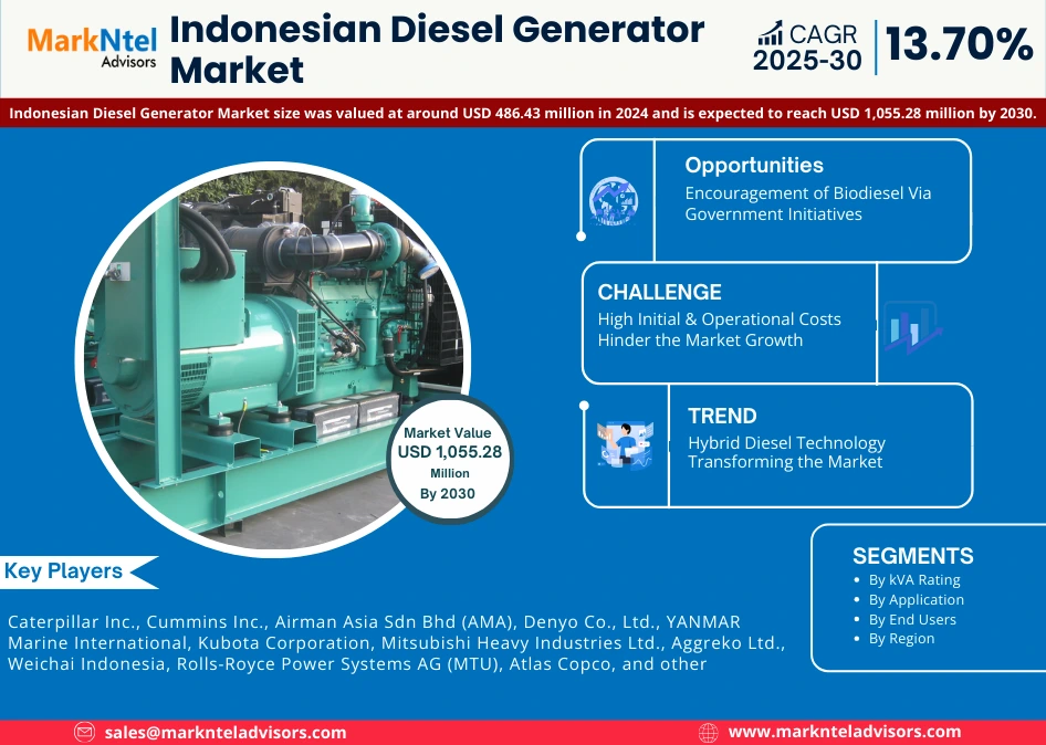 According to MarkNtel Advisors study The future of Indonesian Diesel Generator Market size was valued at around USD 486.43 million in 2024 and is expected to reach USD 1,055.28 million by 2030. Along with this, the market is estimated to grow at a CAGR of around 13.70% during the forecast period, i.e., 2025-30.