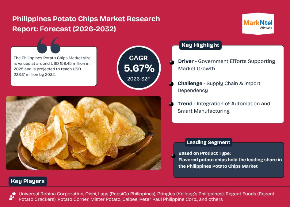 According to MarkNtel Advisors study The future of Philippines Potato Chips Market size is valued at around USD 158.45 million in 2025 and is projected to reach USD 233.17 million by 2032. Along with this, the market is estimated to grow at a CAGR of around 5.67% during the forecast period, i.e., 2026-32.