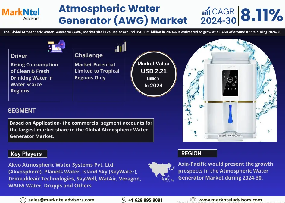 MarkNtel Advisors, a leading market research and consulting firm, has announced the release of its latest study titled Atmospheric Water Generator (AWG) Market Research Report: Forecast (2024–2030). This report provides a detailed assessment of the Atmospheric Water Generator (AWG) Market, covering its evolving dynamics, emerging trends, key growth drivers, major challenges, and competitive landscape.