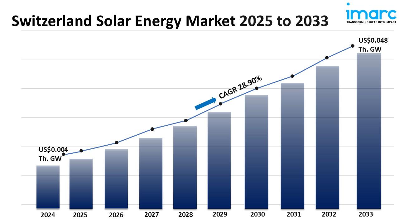 The Switzerland solar energy market was valued at 0.004 Thousand Gigawatt in 2024 and is projected to reach 0.048 Thousand Gigawatt by 2033, exhibiting a CAGR of 28.90% during 2025-2033. Driven by strong government support, rising electricity demand, and sustainability goals, the market benefits from incentives like feed-in tariffs and subsidies promoting residential and commercial solar adoption. Technological advancements and decentralized energy policies further support growth.