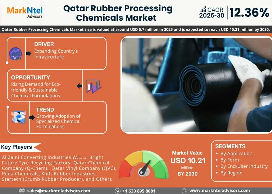 As per recent study by Markntel Advisors The Qatar Rubber Processing Chemicals Market size is valued at around USD 5.7 million in 2025 and is expected to reach USD 10.21 million by 2030. Along with this, the market is estimated to grow at a CAGR of around 12.36% during the forecast period, i.e., 2025-30.