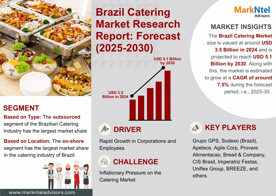 According to MarkNtel Advisors study The future of Brazil Catering Market size is valued at around USD 3.5 Billion in 2024 and is projected to reach USD 5.1 Billion by 2030. Along with this, the market is estimated to grow at a CAGR of around 7.5% during the forecast period, i.e., 2025-30.