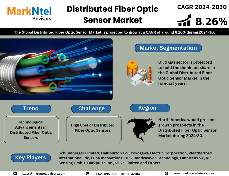 MarkNtel Advisors, a leading market research and consulting firm, has announced the release of its latest study titled Distributed Fiber Optic Sensor Market Research Report: Forecast (2024–2030). This report provides a detailed assessment of the Distributed Fiber Optic Sensor Market, covering its evolving dynamics, emerging trends, key growth drivers, major challenges, and competitive landscape.