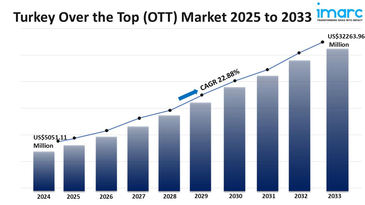 The Turkey Over the Top (OTT) market size was valued at USD 5,051.11 Million in 2024 and is projected to reach USD 32,263.96 Million by 2033, growing at a CAGR of 22.88% during 2025-2033. Growth is driven by increasing internet and smartphone penetration, rising demand for localized on-demand content, and strategic partnerships between telecom operators and OTT providers offering bundled services. These factors fuel a shift in media consumption patterns, expanding the Turkey Over the Top (OTT) market share.