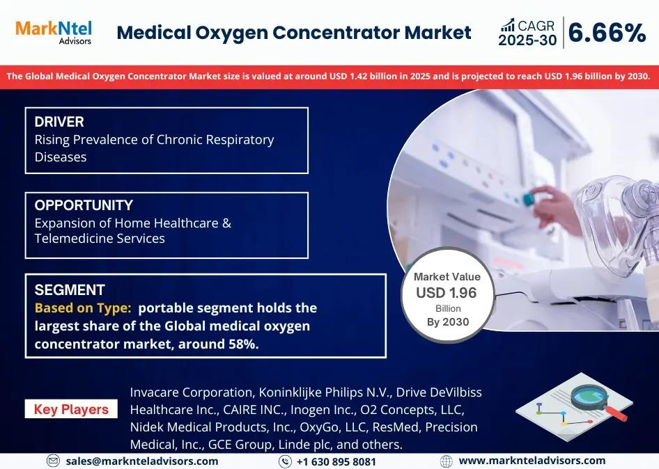 MarkNtel Advisors, a leading market research and consulting firm, has announced the release of its latest study titled Medical Oxygen Concentrator Market Research Report: Forecast (2025–2030). This report provides a detailed assessment of the Medical Oxygen Concentrator, covering its evolving dynamics, emerging trends, key growth drivers, major challenges, and competitive landscape.