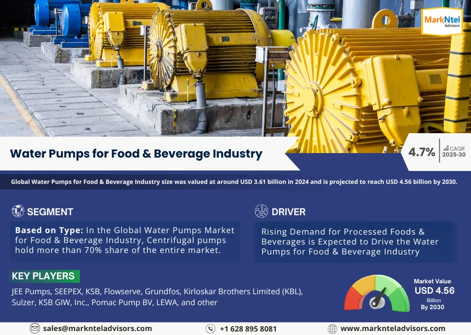 According to MarkNtel Advisors study The future of Water Pumps for Food & Beverage Industry Market size was valued at around USD 3.61 billion in 2024 and is projected to reach USD 4.56 billion by 2030. Along with this, the market is estimated to grow at a CAGR of around 4.7% during the forecast period, i.e., 2025-30.