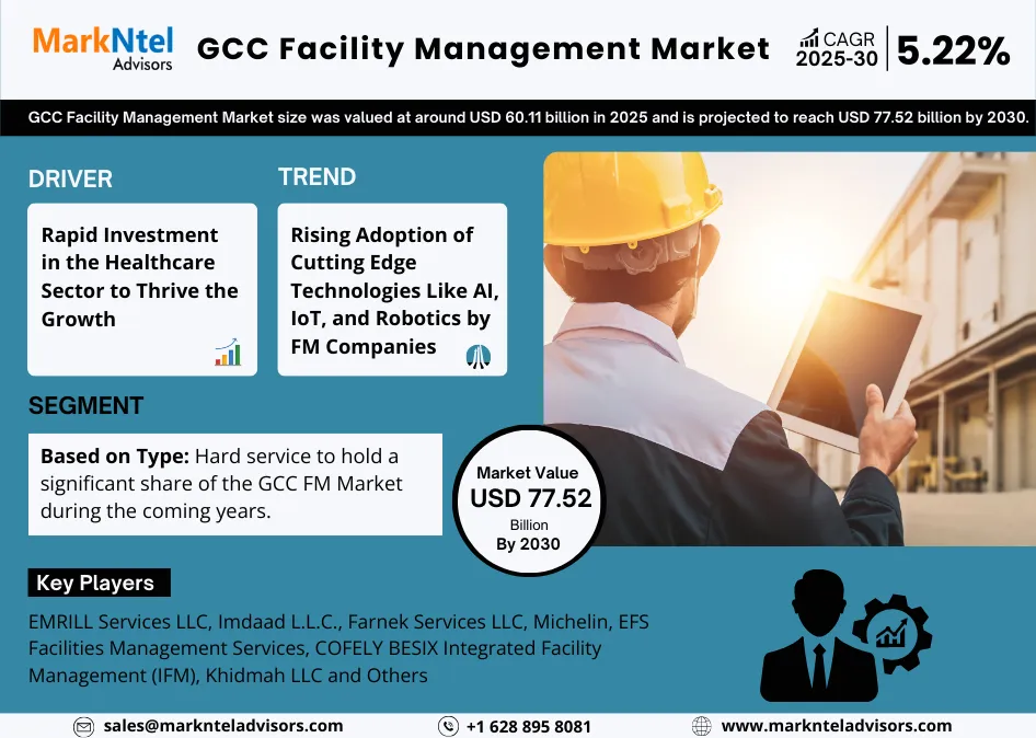According to MarkNtel Advisors study The future of GCC Facility Management Market size was valued at around USD 60.11 billion in 2025 and is projected to reach USD 77.52 billion by 2030. Along with this, the market is estimated to grow at a CAGR of around 5.22% during the forecast period, i.e., 2025-30.
