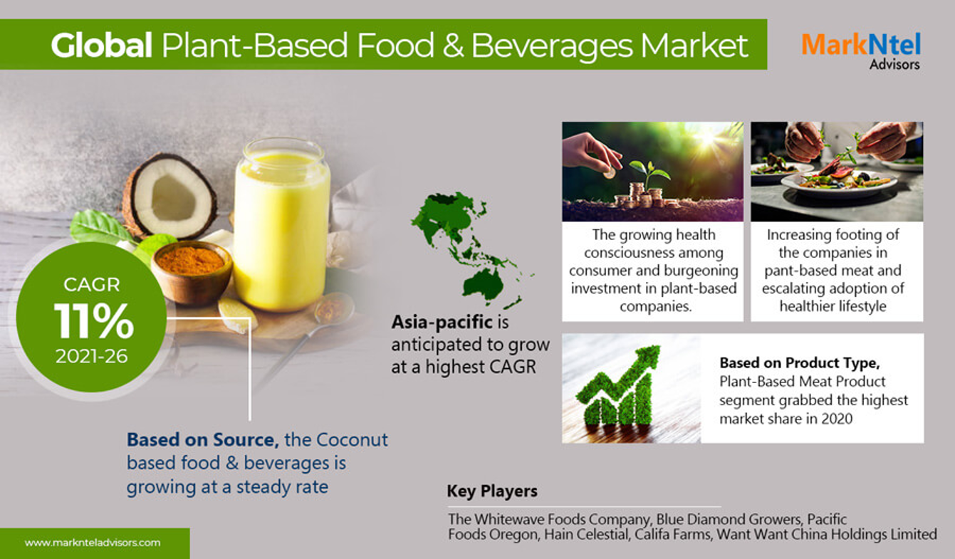 According to MarkNtel Advisors study The future of Plant Based Food & Beverages Market is anticipated to grow at a CAGR of around 11% during 2021-26F. The growth of the market is attributed to rising lactose intolerance populace worldwide, increasing millennial inclination for vegan food along with the adoption of low-calorie food options among people due to hectic lifestyle. Moreover, the mounting launch of various plant-based beverages along with rapid urbanization and escalating health concern propelling the demand for animal-based diets are the factors fueling the demand for plant-based food and beverages in the forthcoming years.