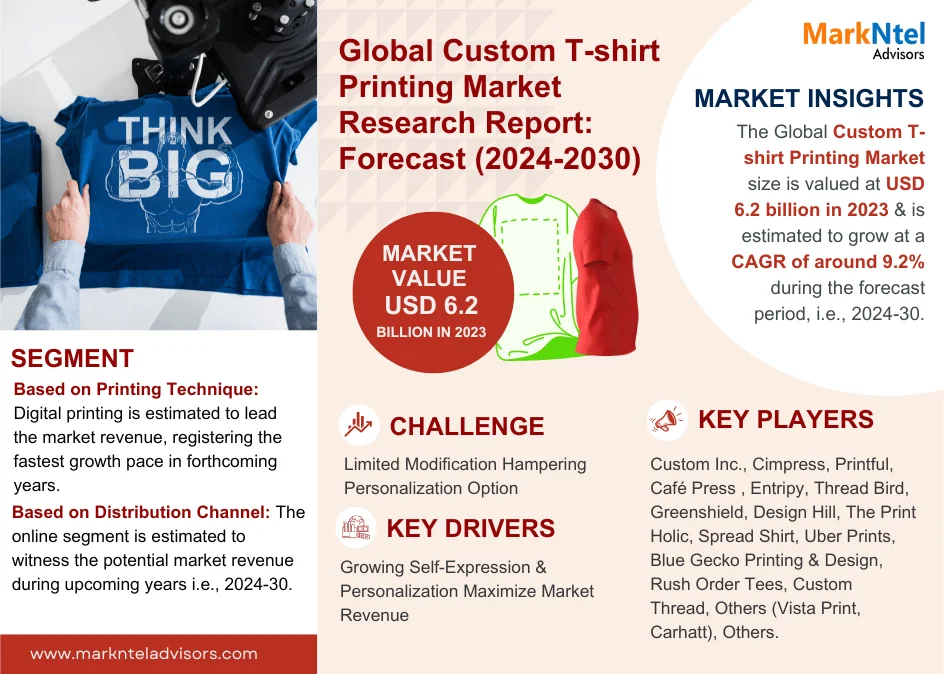 MarkNtel Advisors, a leading market research and consulting firm, has announced the release of its latest study titled Custom T-shirt Printing Market Research Report: Forecast (2024–2030). This report provides a detailed assessment of the Custom T-shirt Printing Market, covering its evolving dynamics, emerging trends, key growth drivers, major challenges, and competitive landscape.