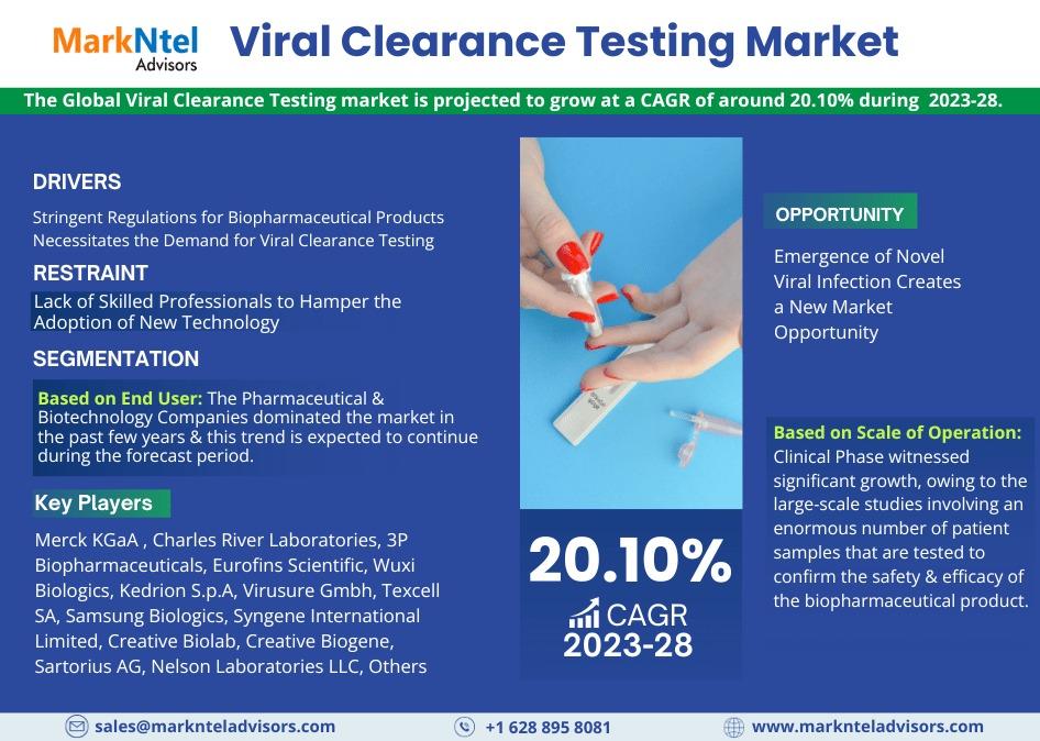 MarkNtel Advisors, a leading market research and consulting firm, has announced the release of its latest study titled Viral Clearance Testing Market Research Report: Forecast (2023-2028). This report provides a detailed assessment of the Viral Clearance Testing Market, covering its evolving dynamics, emerging trends, key growth drivers, major challenges, and competitive landscape.