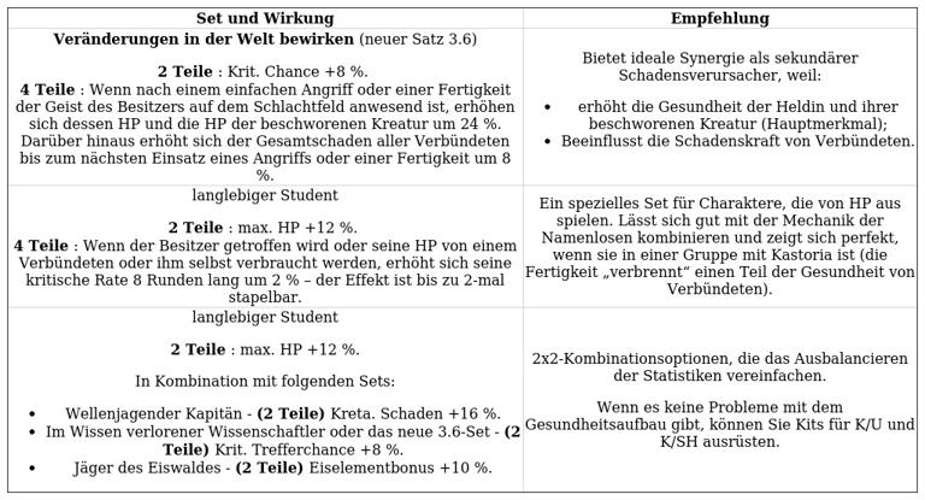 Ein vollständiges Set, insbesondere das „Gletscherwaldjäger“-Set, kann erstmals effektiv genutzt werden, sofern hochwertige Komponenten verfügbar sind. Dieses Set steigert nicht nur den Elementarbonus, sondern erhöht außerdem den kritischen Schaden nach der Aktivierung der Superfähigkeit, was die Schadensleistung des Charakters deutlich verbessert. Allerdings ist zu beachten, dass diese Verbesserung bei der Qualle keine Wirkung zeigt.