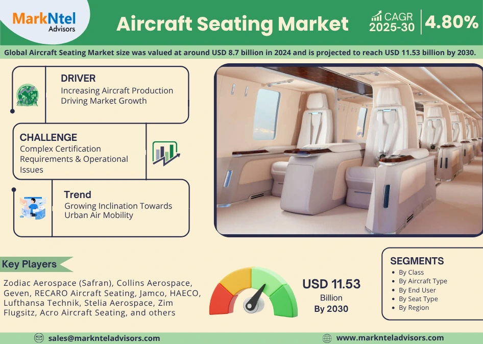 MarkNtel Advisors, a leading market research and consulting firm, has announced the release of its latest study titled “ Global Aircraft Seating Market Analysis, 2025-2030.”