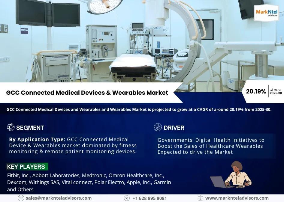 MarkNtel Advisors, a leading market research and consulting firm, has announced the release of its latest study titled GCC Connected Medical Devices and Wearables Market Research Report: Forecast (2025-2030). This report provides a detailed assessment of the GCC Connected Medical Devices and Wearables Market, covering its evolving dynamics, emerging trends, key growth drivers, major challenges, and competitive landscape.