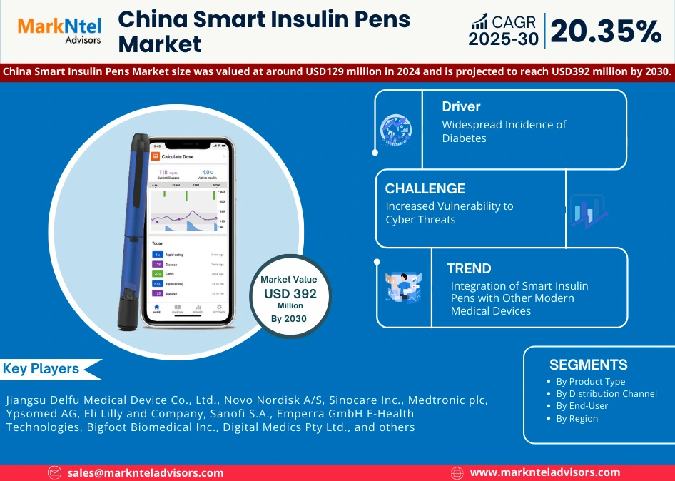 According to MarkNtel Advisors study The future of China Smart Insulin Pens Market size was valued at around USD129 million in 2024 and is projected to reach USD392 million by 2030. Along with this, the market is estimated to grow at a CAGR of around 20.35% during the forecast period, i.e., 2025-30