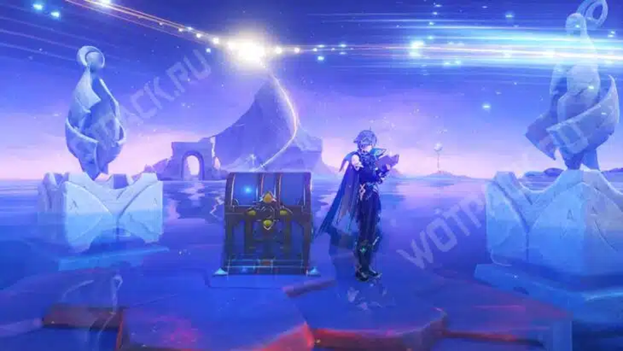 In Genshin Impact befindet sich die luxuriöse Unterwassertruhe in der Nähe einer hell erleuchteten Plattform. Sie ist von antiken Statuen umgeben, die eine mystische Atmosphäre schaffen. Um die Truhe zu erreichen, musst du ein spezielles Rätsel lösen, das aus drei Spiegeln besteht.