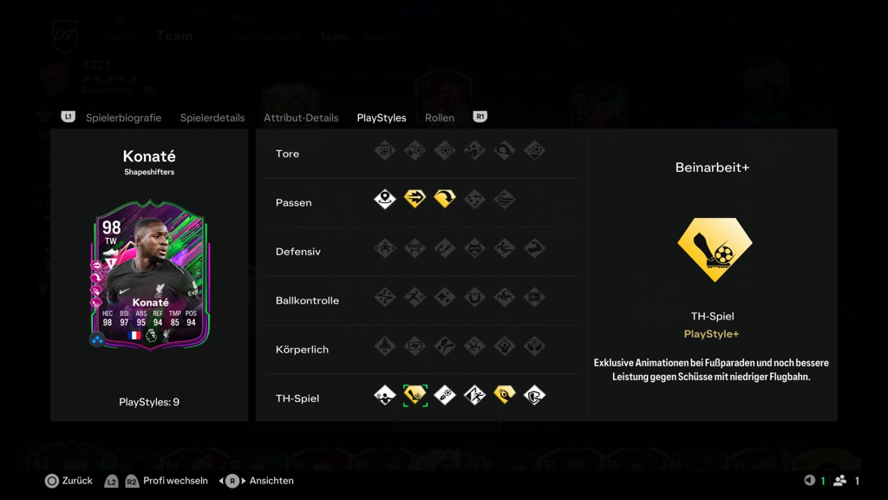 Besonders hervorzuheben sind seine Passfähigkeiten: Mit drei verschiedenen Pass-Playstyles, darunter „Schnittstellenpass“ und „Weiterpass“ in Gold, kann er den Spielaufbau effizient lenken. Ob kurze Pässe oder hohe Bälle – Konaté bringt die Bälle präzise und mit hoher Passschärfe zum Mitspieler.