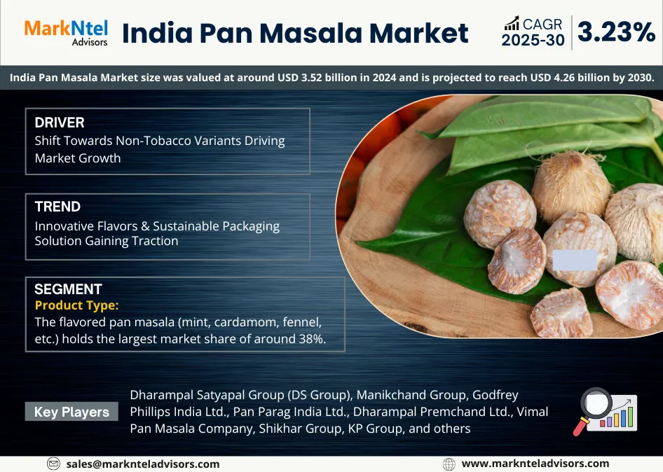 The India Pan Masala Market size was valued at around USD 3.52 billion in 2024 and is projected to reach USD 4.26 billion by 2030. Along with this, the market is estimated to grow at a CAGR of around 3.23% during the forecast period, i.e., 2025-30. According to MarkNtel Advisors Study.