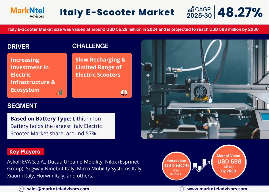 The Italy Electric Scooter Market size was valued at around USD 56.29 million in 2024 and is projected to reach USD 598 million by 2030. Along with this, the market is estimated to grow at a CAGR of around 48.27% during the forecast period, i.e., 2025-30. According to MarkNtel Advisors Study.
