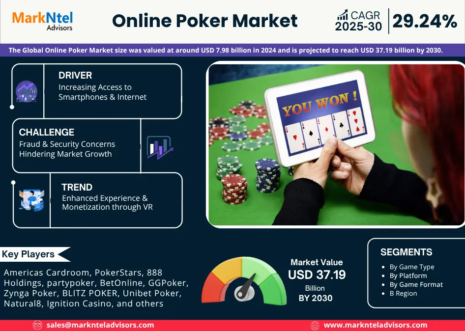 The Global Online Poker Market size was valued at around USD 7.98 billion in 2024 and is projected to reach USD 37.19 billion by 2030. Along with this, the market is estimated to grow at a CAGR of around 29.24% during the forecast period, i.e., 2025-30. According to MarkNtel Advisors Study.