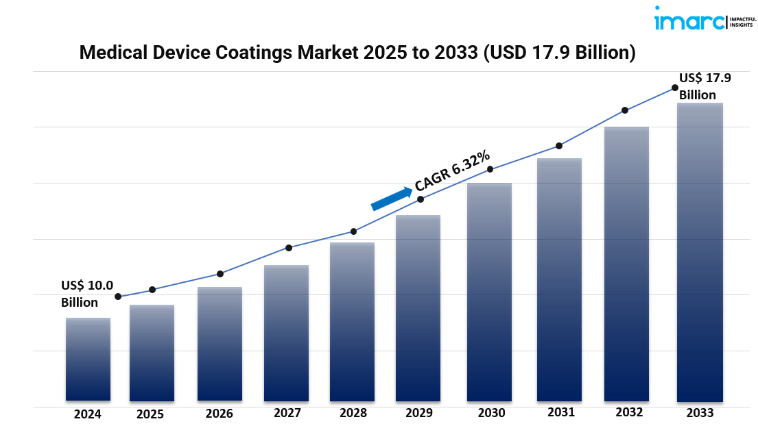 The global medical device coatings market reached USD 10.0 Billion in 2024 and is projected to grow to USD 17.9 Billion by 2033. It is expected to expand at a CAGR of 6.32% during the forecast period 2025-2033. This growth is driven by increasing adoption of minimally invasive procedures and advancements in coating technology enhancing device performance and patient outcomes.
