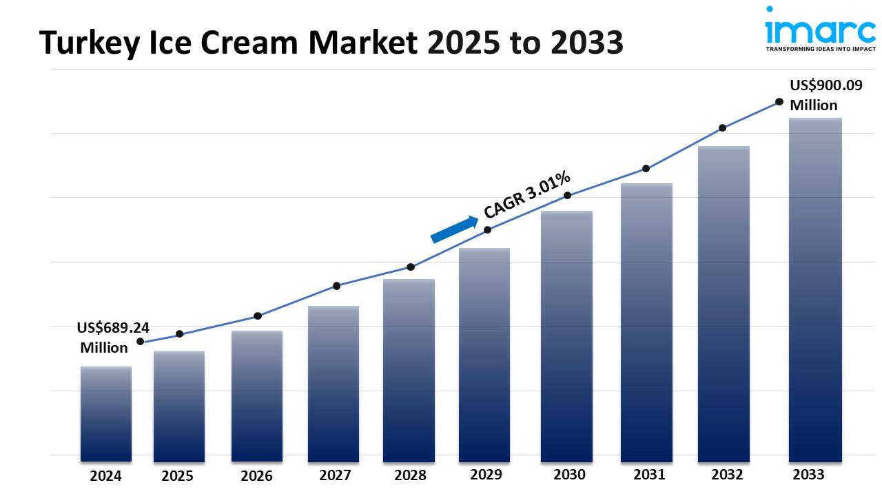 The Turkey Ice Cream Market size reached USD 689.24 Million in 2024. It is projected to reach USD 900.09 Million by 2033, exhibiting a CAGR of 3.01% during 2025-2033. This growth is fueled by increasing consumer interest in innovative flavors, artisanal textures, and plant-based ice cream options, alongside persistent popularity of traditional varieties. Expanding retail and foodservice outlets with a focus on clean-label ingredients and appealing formats are reshaping distribution strategies and enhancing market share.