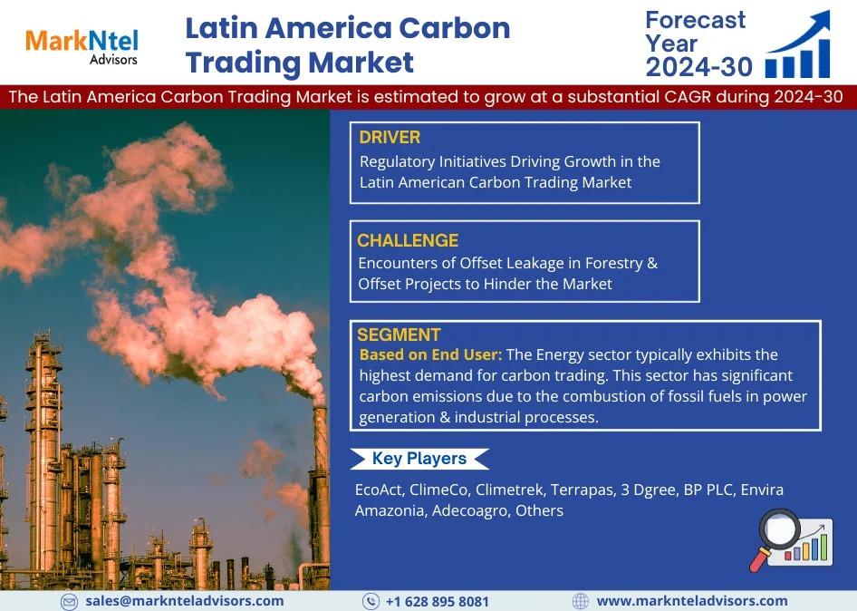 MarkNtel Advisors, a leading market research and consulting firm, has announced the release of its latest study titled Latin America Carbon Trading Market Research Report: Forecast (2024–2030). This report provides a detailed assessment of the Latin America Carbon Trading, covering its evolving dynamics, emerging trends, key growth drivers, major challenges, and competitive landscape.