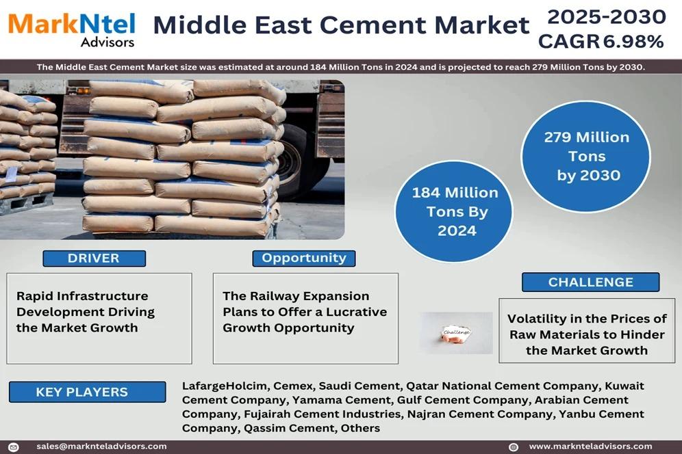 MarkNtel Advisors, a leading market research and consulting firm, has announced the release of its latest study titled Middle East Cement Market Research Report: Forecast (2025-2030). This report provides a detailed assessment of the Middle East Cement Market, covering its evolving dynamics, emerging trends, key growth drivers, major challenges, and competitive landscape.