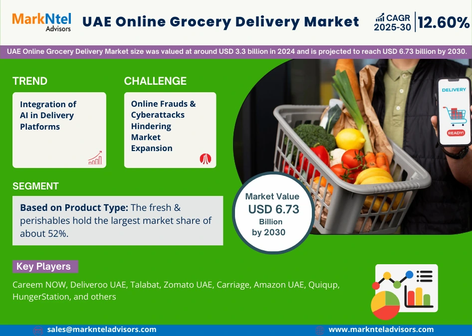 The UAE Online Grocery Delivery Market size was valued at around USD 3.3 billion in 2024 and is projected to reach USD 6.73 billion by 2030. Along with this, the market is estimated to grow at a CAGR of around 12.60% during the forecast period, i.e., 2025-30. According to MarkNtel Advisors Study.