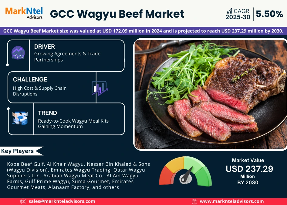 The GCC Wagyu Beef Market size was valued at USD 172.09 million in 2024 and is projected to reach USD 237.29 million by 2030. Along with this, the market is estimated to grow at a CAGR of around 5.50% during the forecast period, i.e., 2025-30. According to MarkNtel Advisors Study.